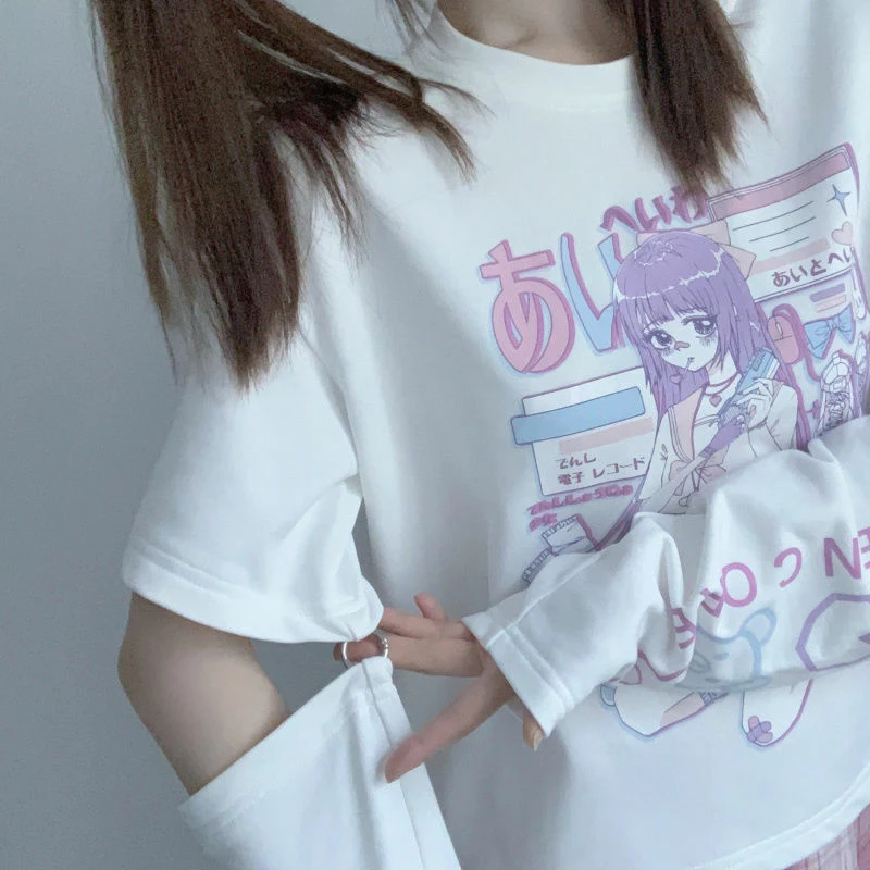 This short-sleeve tee is a must-have for any anime lover or e-girl; mix and match with a skirt, thigh-high socks, and fresh kicks! Featuring a purple hair girl and her pistol with patterned arm warmers to complete the outfit. With a classic look, this light tee is great to add some fun to your weekend outfits. The soft material feels just right against your skin and will make you stand out.