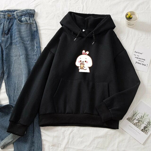 Our Bunny & Bubble Tea hoodie is made of super-soft cotton and polyester and is notable for its oversized fit and generously cut design. Match this hoodie with some comfy bottoms and chunky kicks for an effortlessly chilled vibe. It’s a must-have for anyone who loves bunnies and bubble tea.