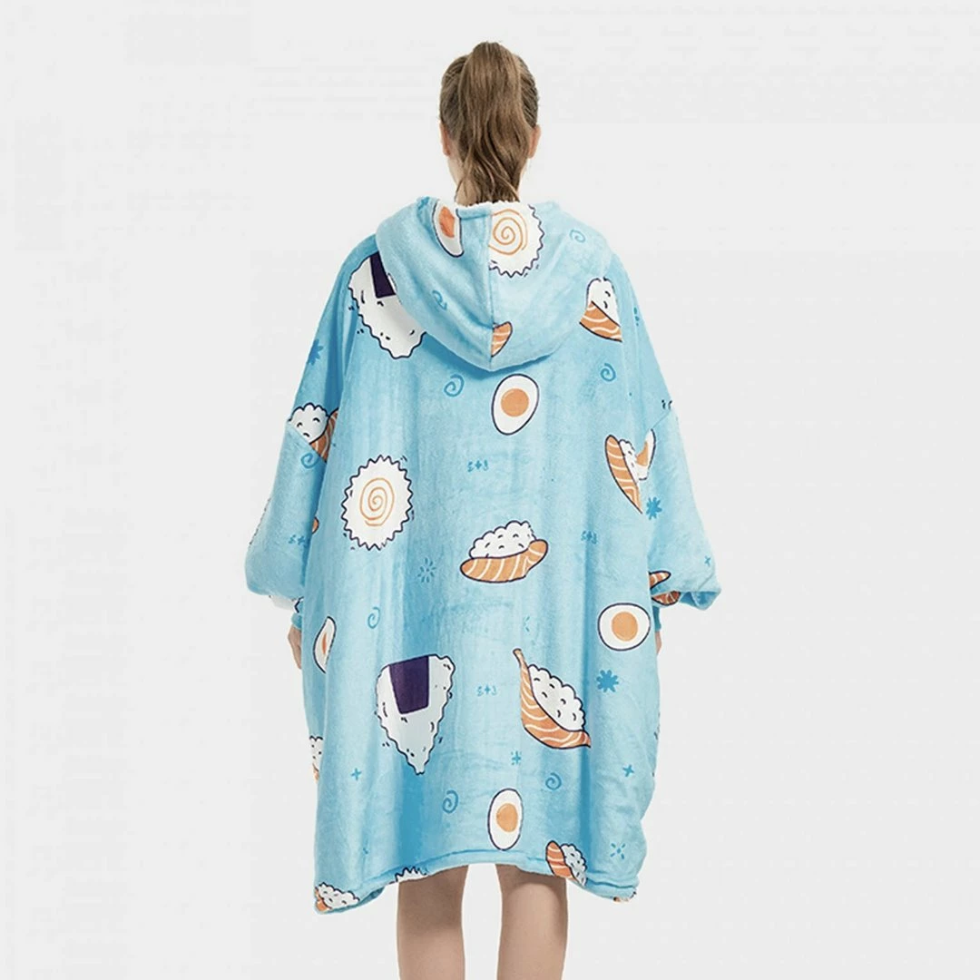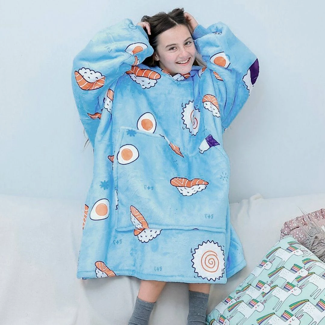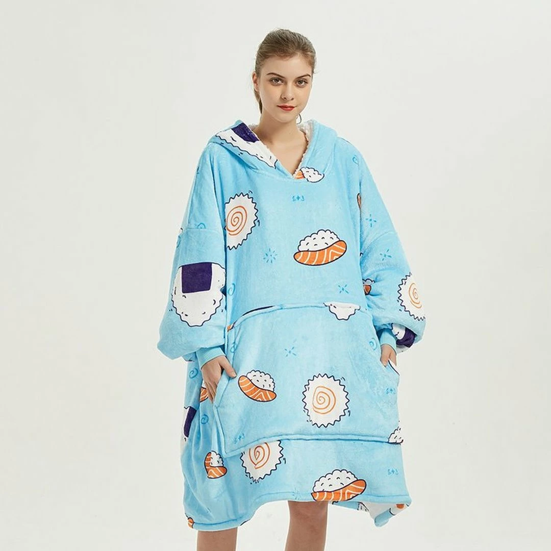 This Blanket Hoodie is the coziest, softest hoodie you will ever own featuring a cartoon sushi design printed on a light blue oversized hoodie. Super comfy, trendy, and a perfect gift for yourself or family or friends for any occasion. Wrap in the warmth and comfort of our wearable blanket hoodie. With a huge front kangaroo pocket for keeping your hands warm and cozy, this soft, fluffy hoodie will be your new favorite winter must-have.