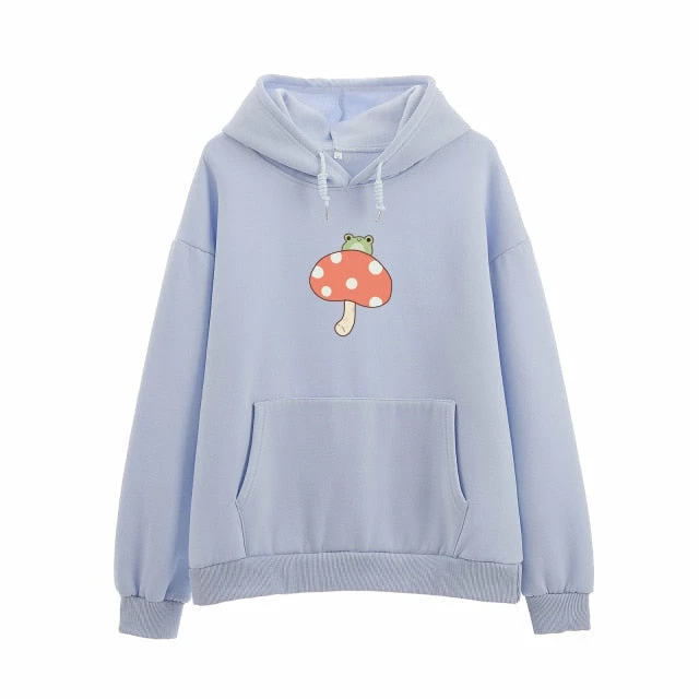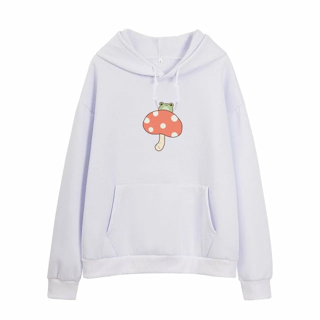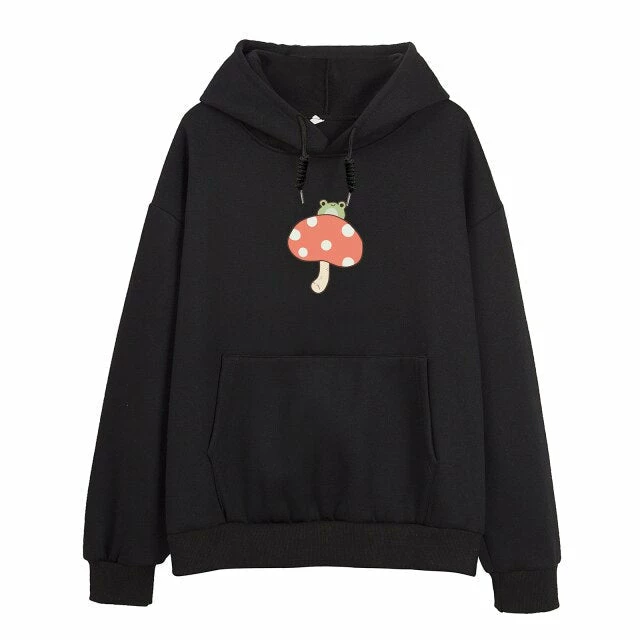 A hoodie designed for all the frog and mushroom lovers out there, featuring a kawaii frog hiding behind a red-spotted mushroom. This soft part-cotton hoodie features a kangaroo pocket at the front and is perfect for taking along on casual walks, working out, or just hanging out at home.
