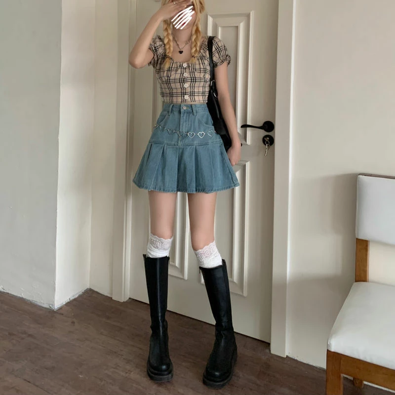 Amp up your outfit of the day with this light denim skirt with a pleated style and front pockets. Team with a cute crop top, knee-high, socks, and black boots for a look we’re obsessing over. You’ll want to wear this skirt whenever you go out!