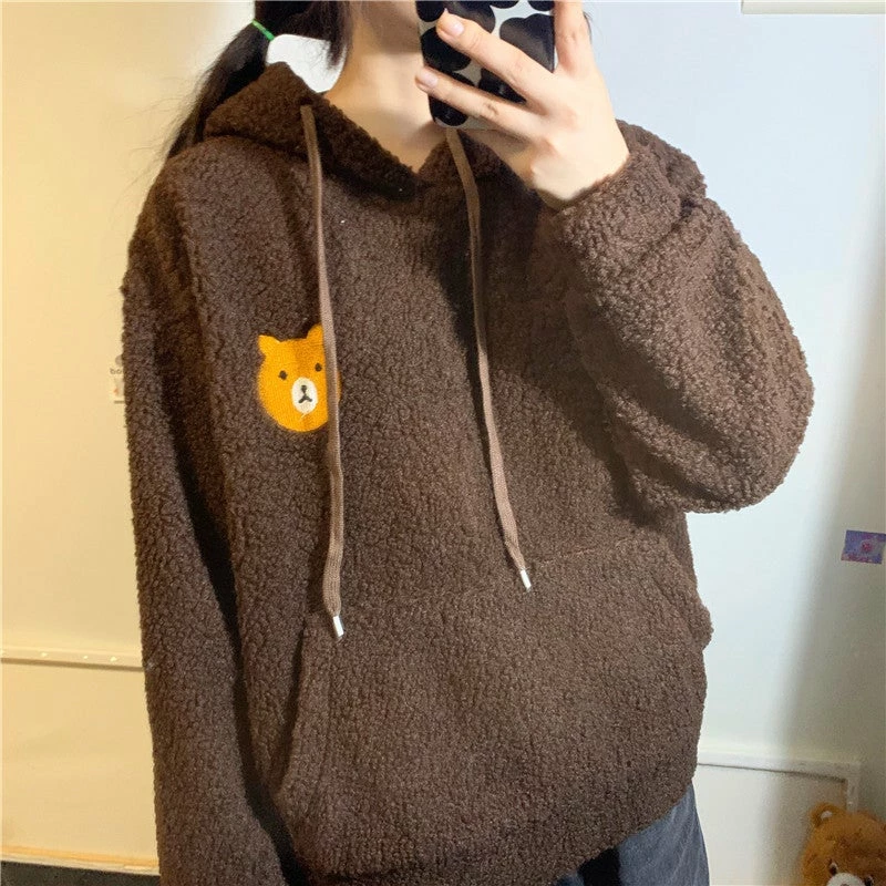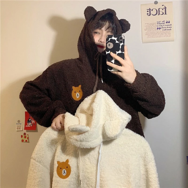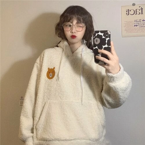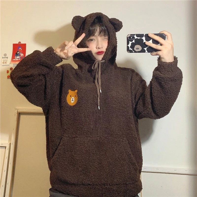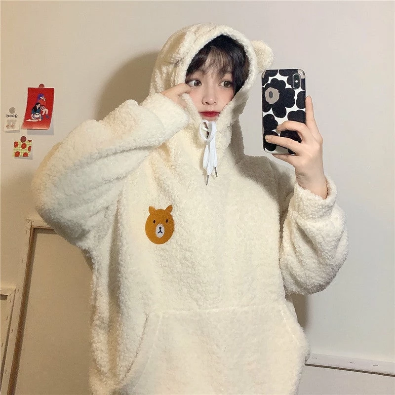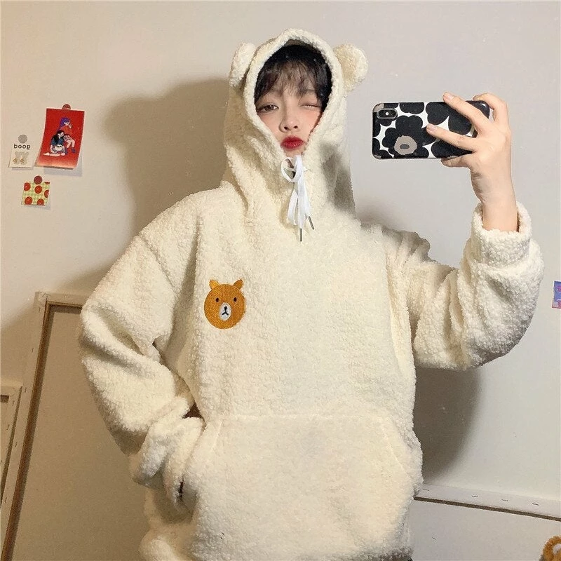 Add this fleece fluffy hoodie to your wardrobe with cute bear ears popping out from the hood. Comfy and cute, this unique hoodie is perfect for lounging around the house or looking cute on the streets. Choose between two different colors. We always recommend choosing 1 size up giving you the oversized hoodie look.