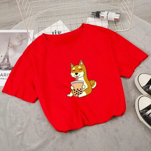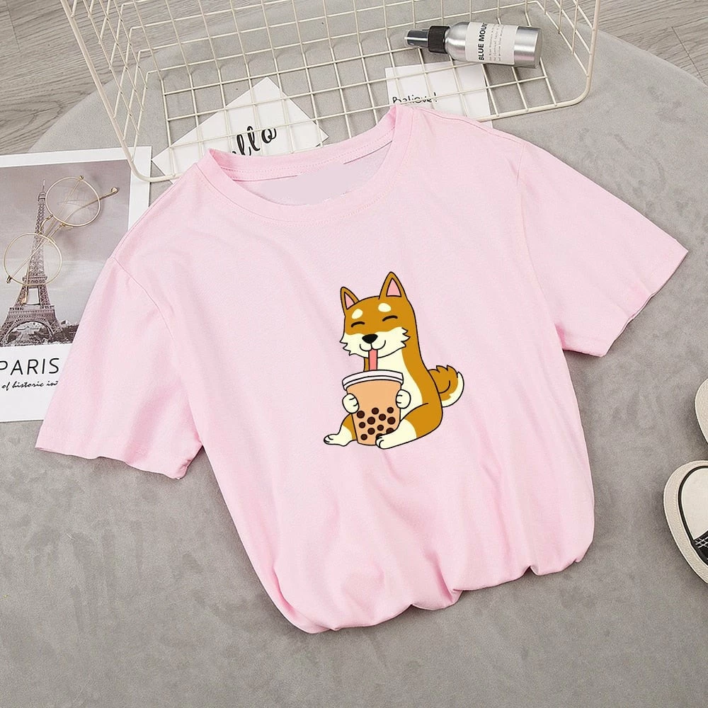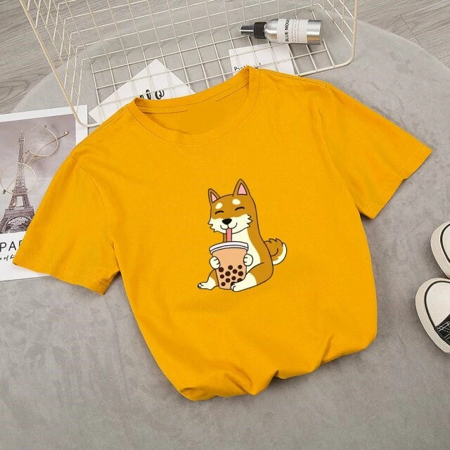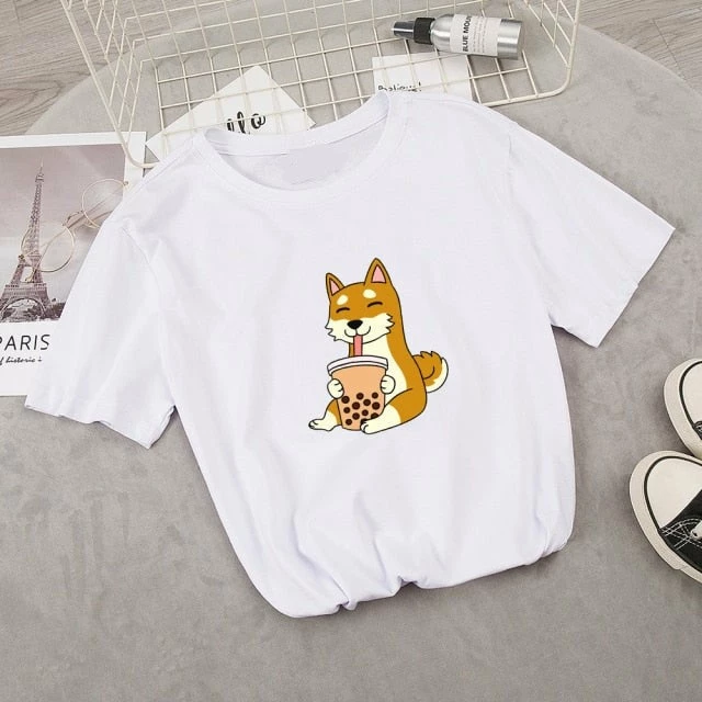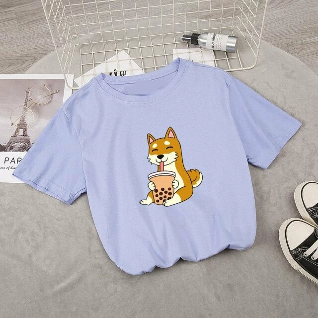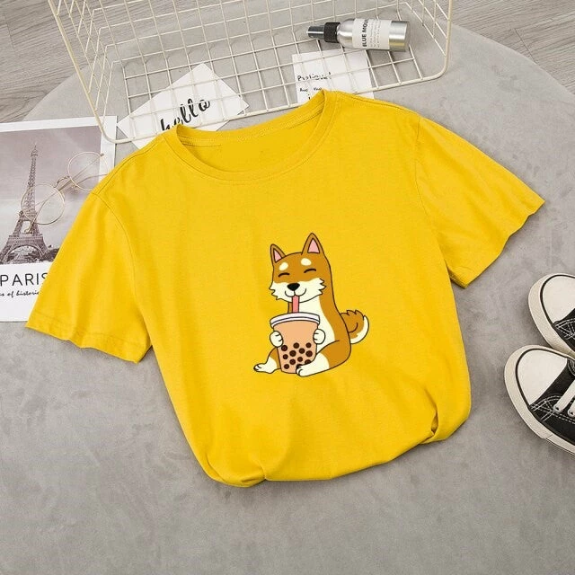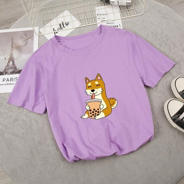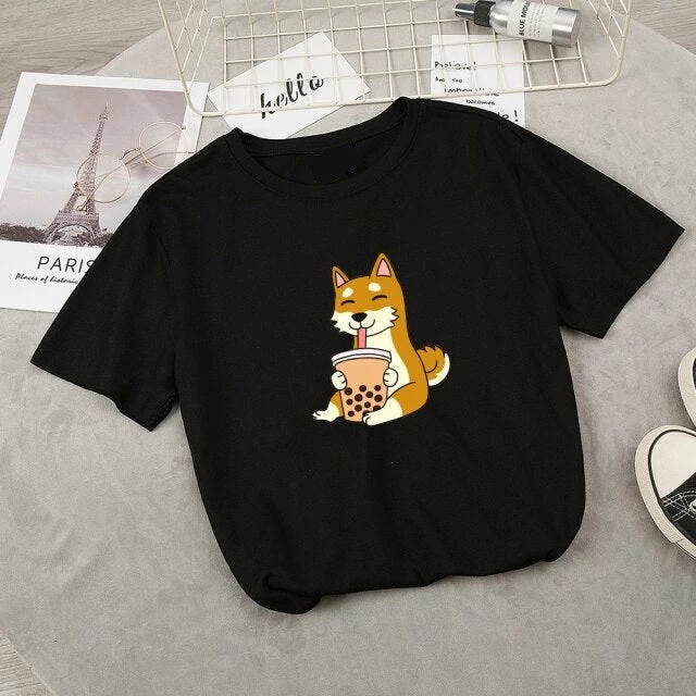 We have, and this is how it’ll look. This women’s tee features an adorable Shiba cheerfully drinking bubble tea and minding his own business printed on the front. With a classic oversized look, this high-quality cotton tee is great to add some fun to your wardrobe.