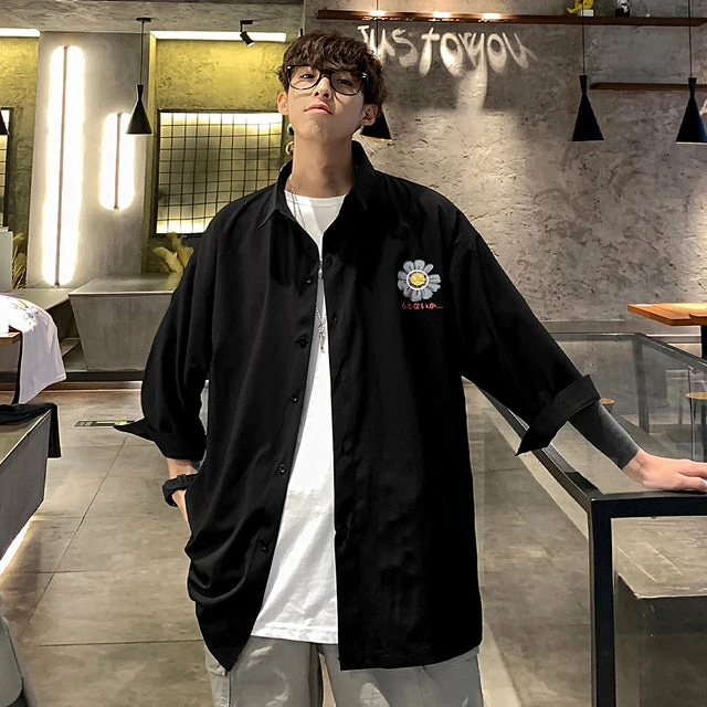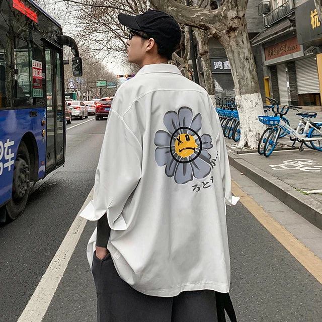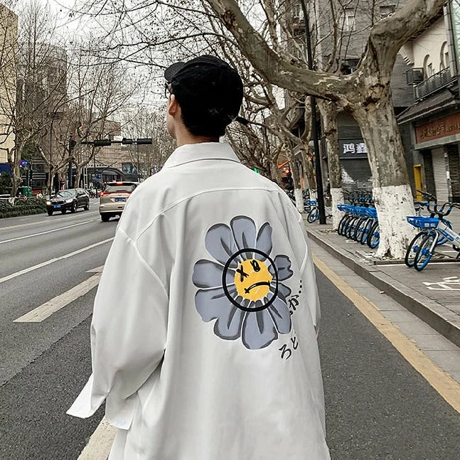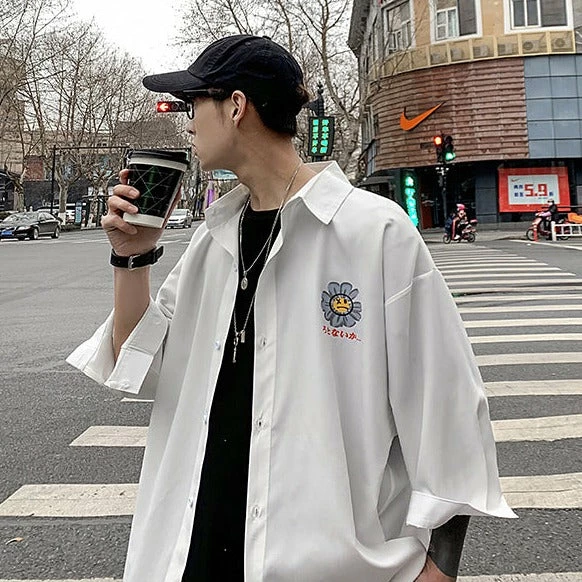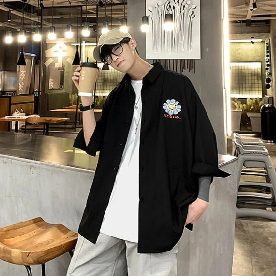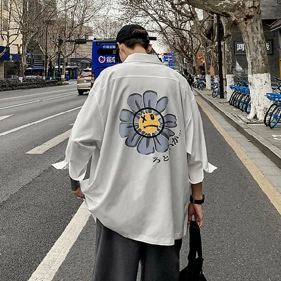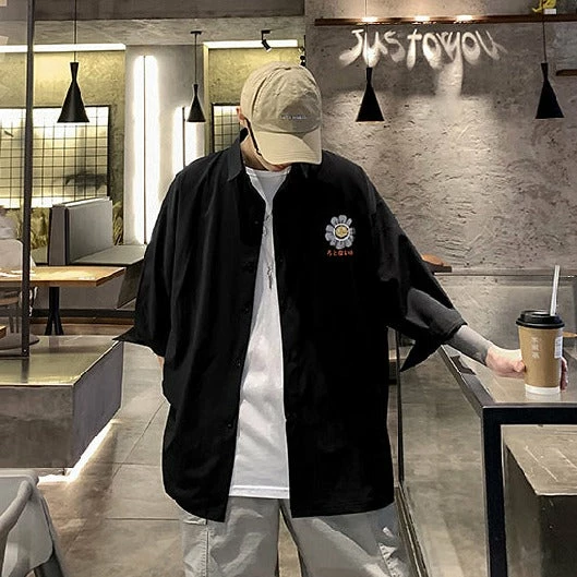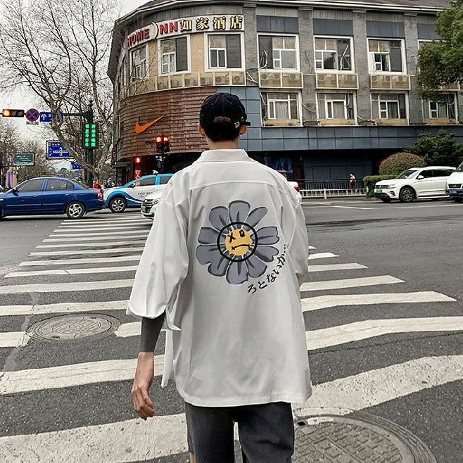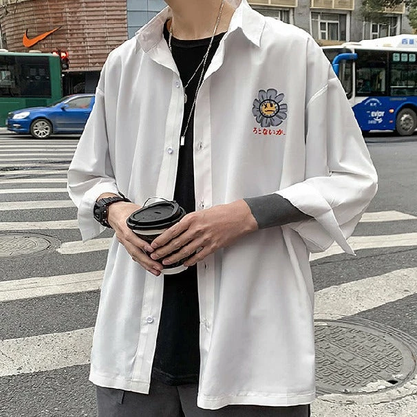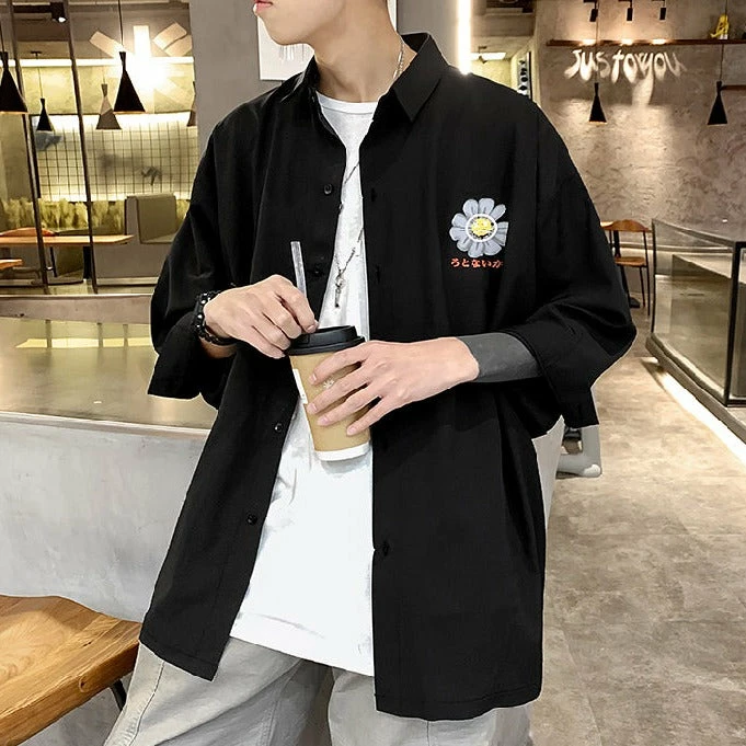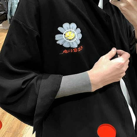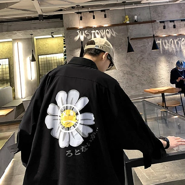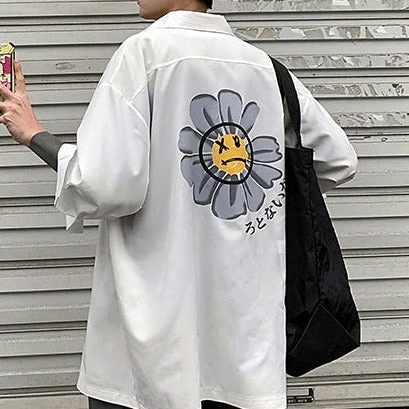 This short-sleeve shirt is a must-have for any shirt lover; mix and match with any black or white outfit! With a classic oversized look, this light, thin shirt is great to add a cool vibe to your wardrobe. The soft cotton and polyester blend material feels just right against your skin featuring a sad flower print and Japanese letters.