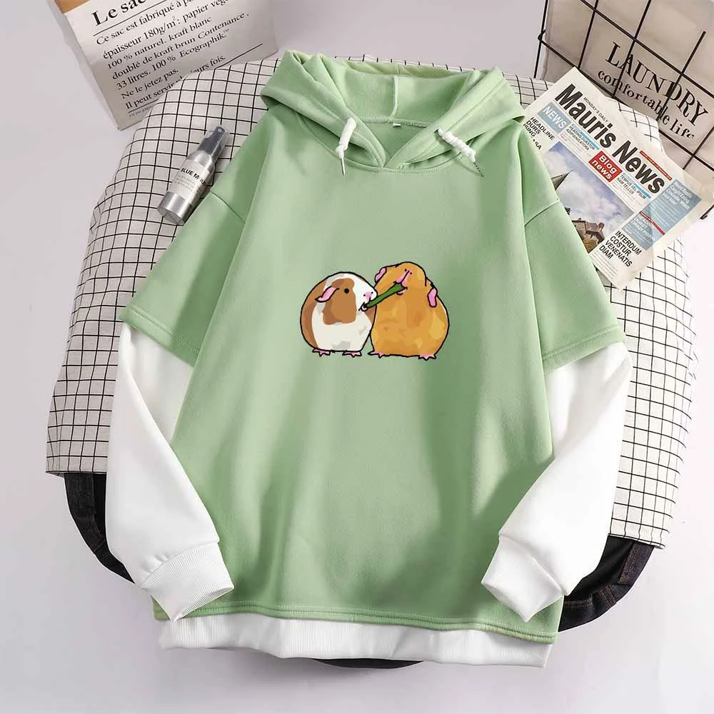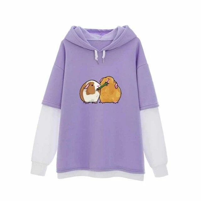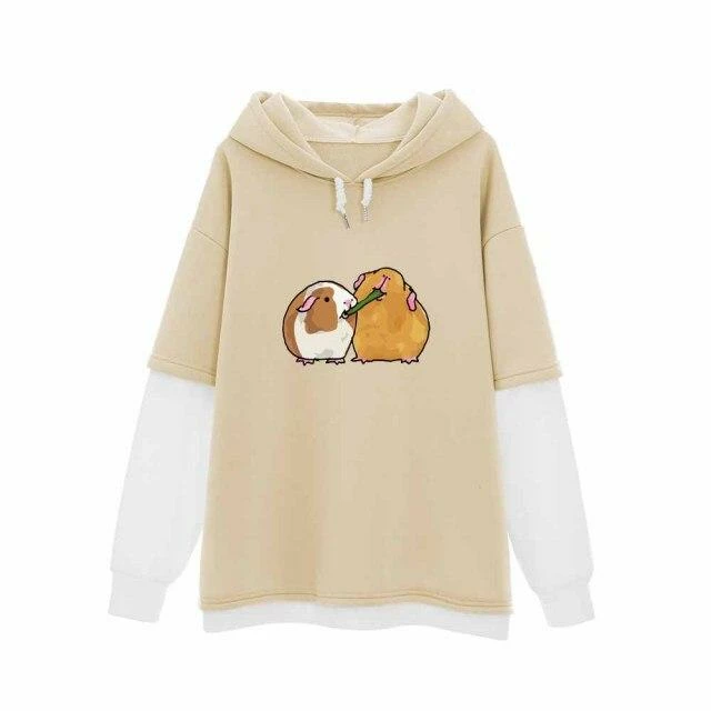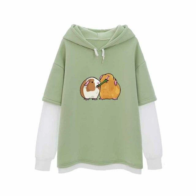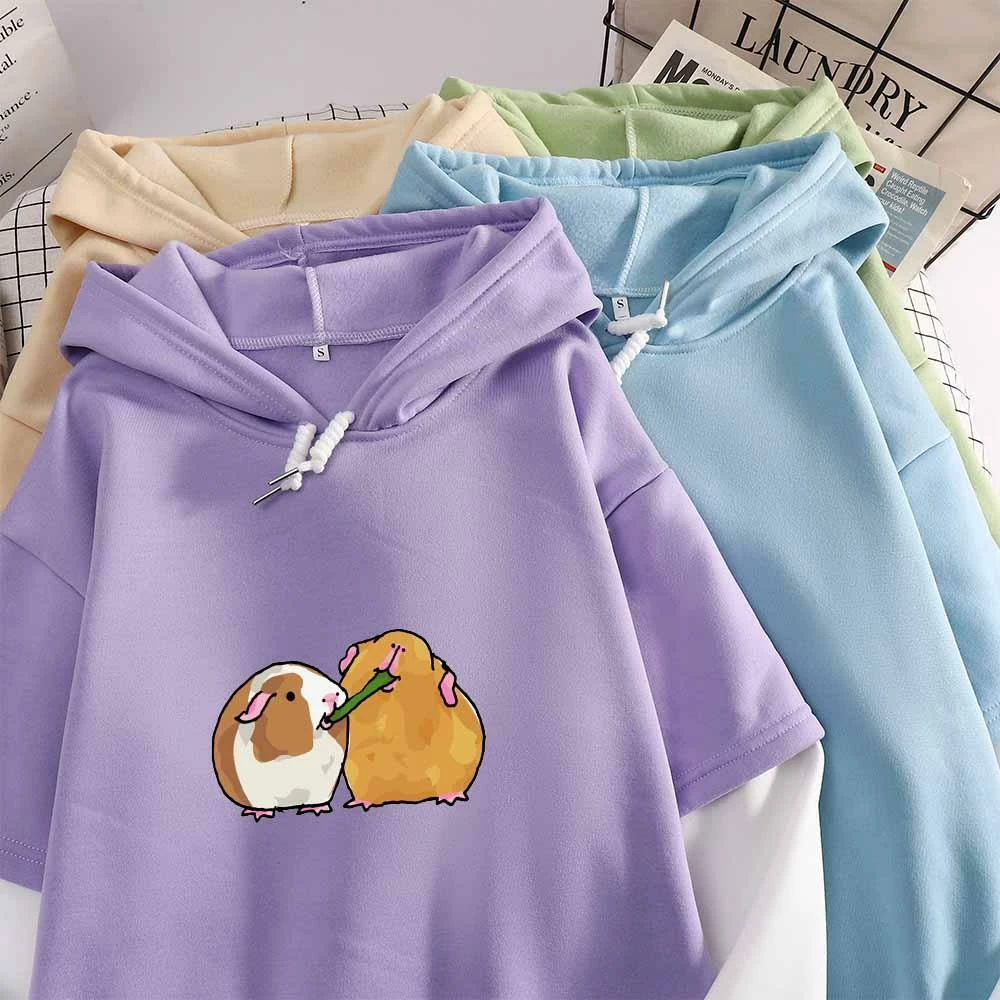 Add some comfy pieces to your wardrobe this season with this unique half-sleeve design hoodie. Featuring a print of two guinea pigs sharing a piece of vegetable on the front and a loose oversized fit.