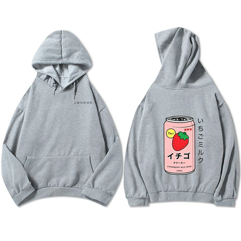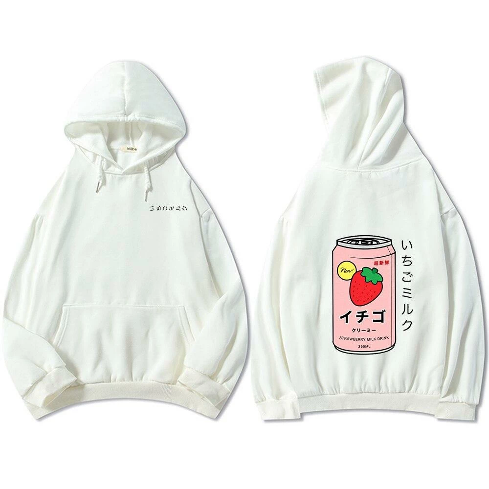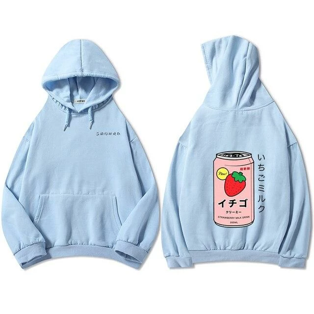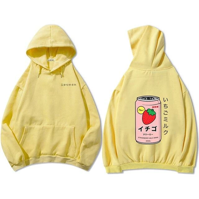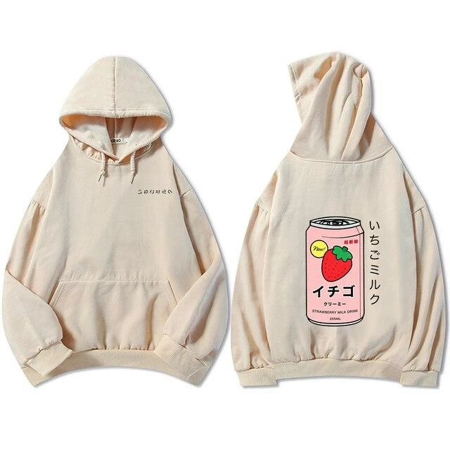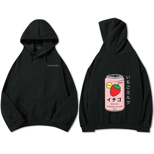 From the infinitely cool Harajuku district in Japan, this hoodie combines cute and cozy with a touch of Tokyo street flavor. Featuring Japanese text on the front and a Strawberry Milk Can on the back of this hoodie. Style this with jeans and fresh kicks to complete the look.