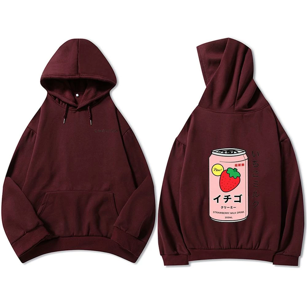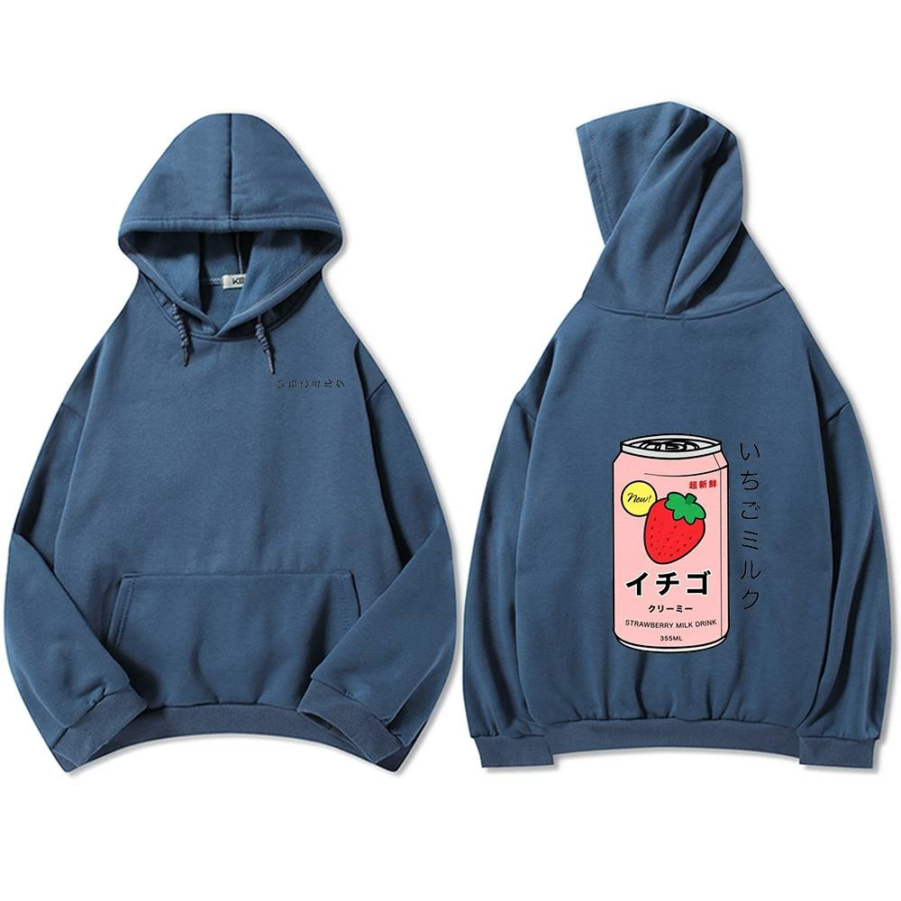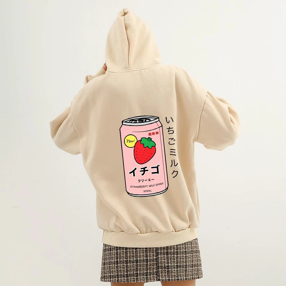 From the infinitely cool Harajuku district in Japan, this hoodie combines cute and cozy with a touch of Tokyo street flavor. Featuring Japanese text on the front and a Strawberry Milk Can on the back of this hoodie. Style this with jeans and fresh kicks to complete the look.