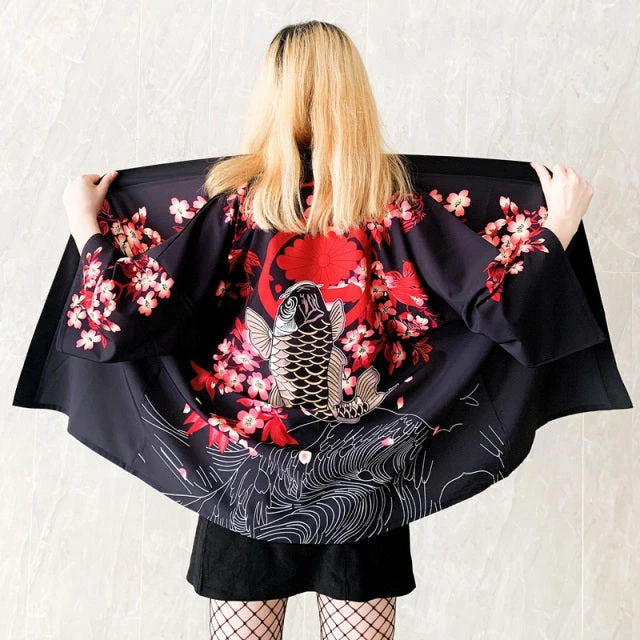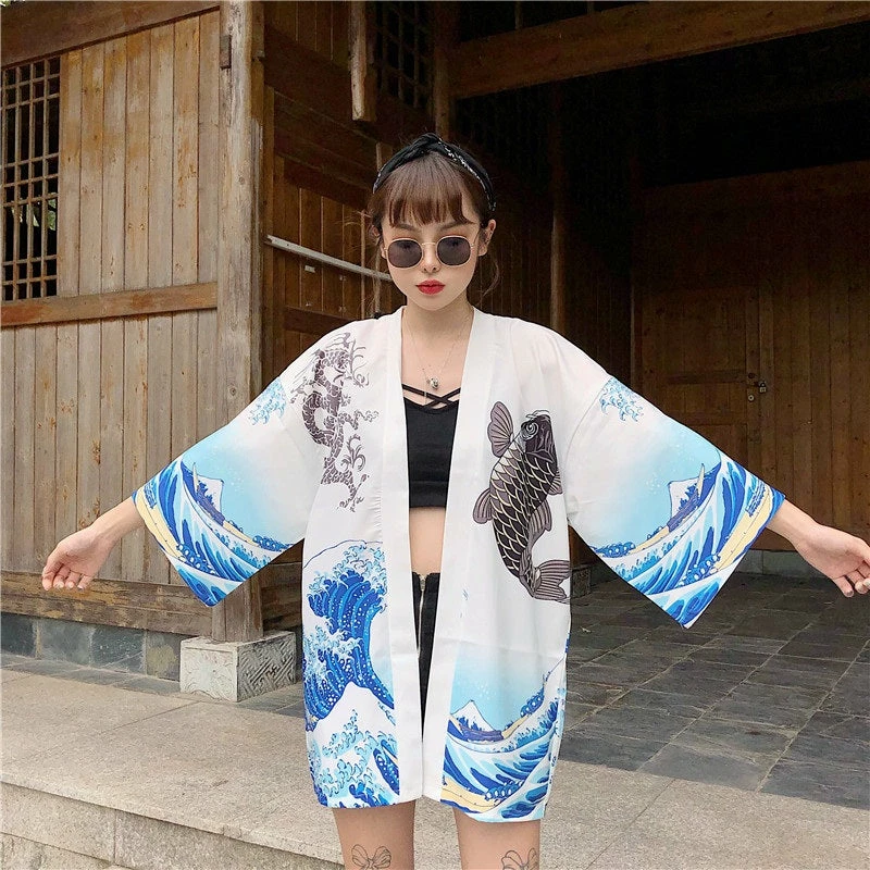 This stunning Kimono features stunning sea waves and energetic koi that are symbols of great luck and wisdom in Asian culture. This elegant garment is perfect for wearing during the day or at night, representing the duality of Japanese life: hardworking during the day and enjoying time with friends at night.