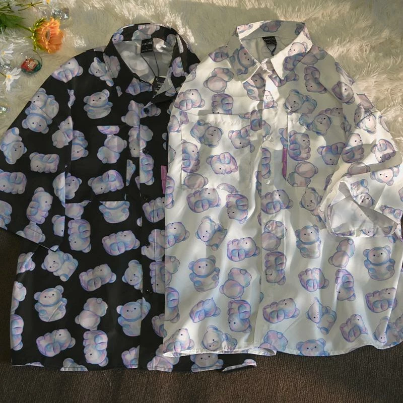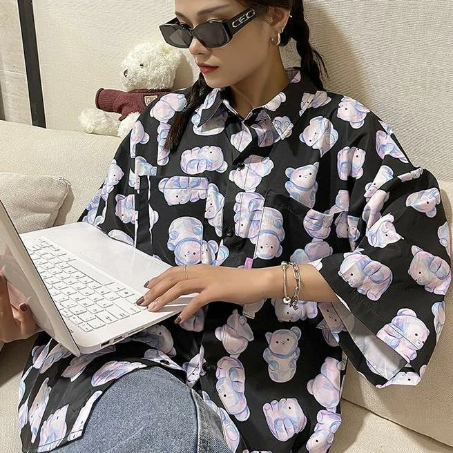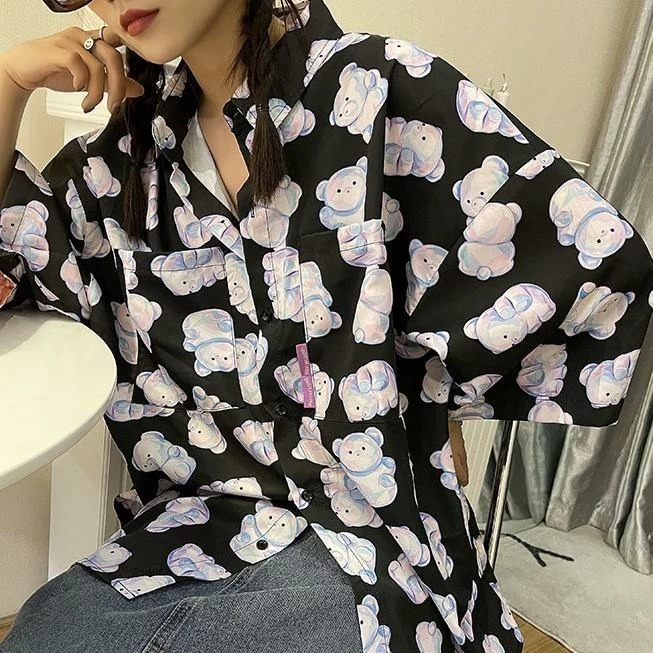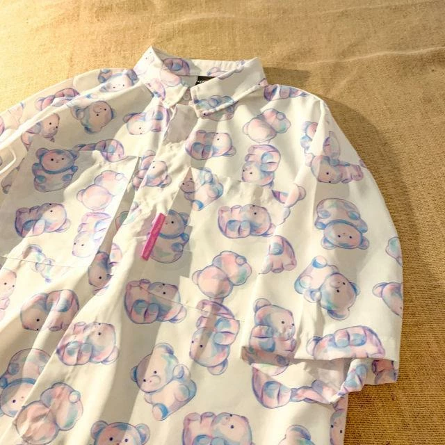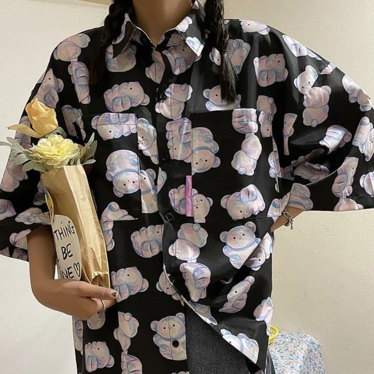 This short-sleeve shirt is a must-have for any bear lover; comes in white and black! With a classic oversized look, this light, thin shirt is great to add a little fun to your wardrobe. The soft material feels just right against your skin, and the unique print features whimsical pastel purple and pink bears that will have everyone wanting one of their own.