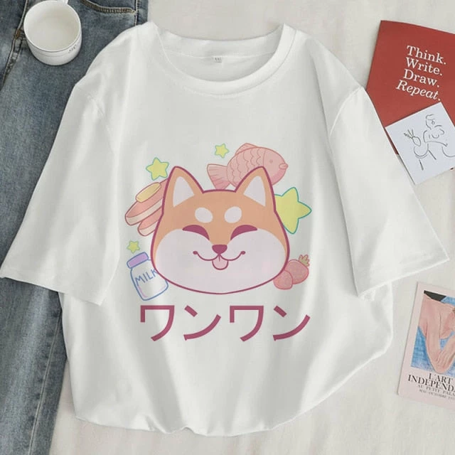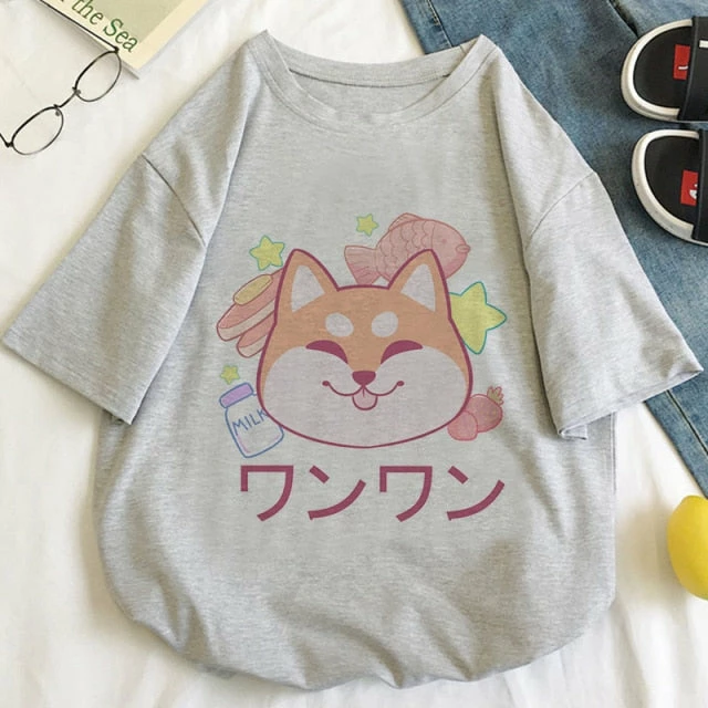 This short-sleeve tee is a cute addition for any Shiba lover; featuring a kawaii cartoon Shiba face with Japanese snacks in the back. A perfect light tee that will add some joy to your everyday life.