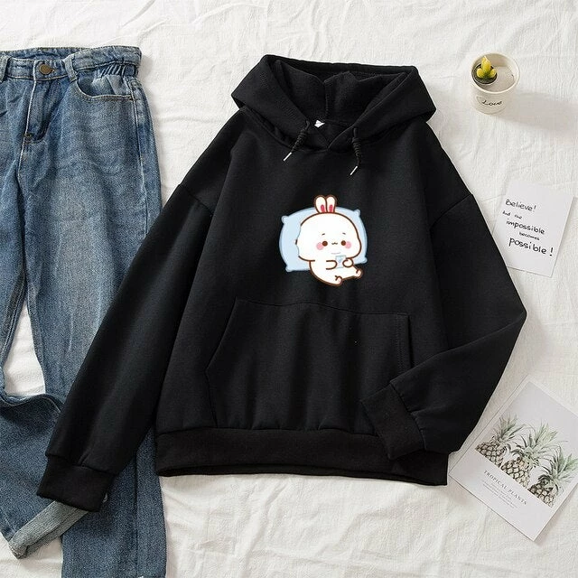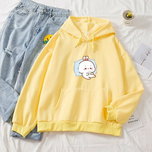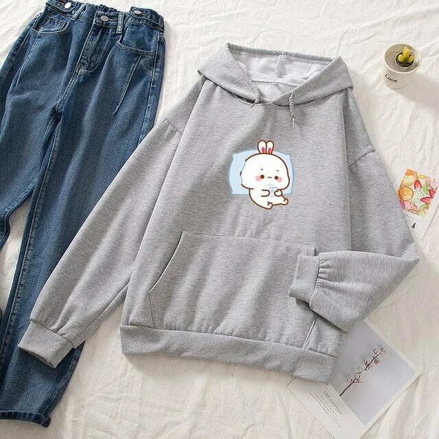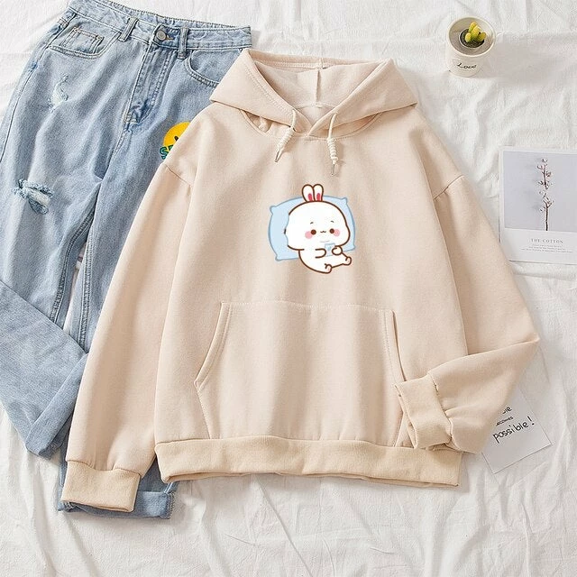 This adorable hoodie is made of super-soft cotton and polyester and is notable for its oversized fit and generously cut design. Match this hoodie with some comfy joggers for an effortlessly chilled vibe at home or even at friends. It’s a must-have for anyone who loves bunnies and kicking back to relax.