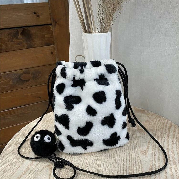 Carry all of your loving belongings on a day out with this Plush Cow Print Drawstring Bag!
