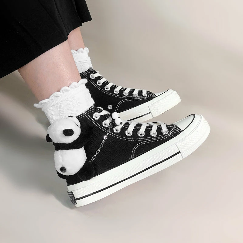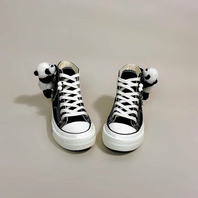 Have you ever worn shoes with a cute plushie pendant hanging from your ankles? These classic black and white Converse-shaped sneakers are perfect for anyone who wants to rep their favourite animal. Featuring a kawaii panda pendant hanging on the side of your sneakers and a light chain.Â