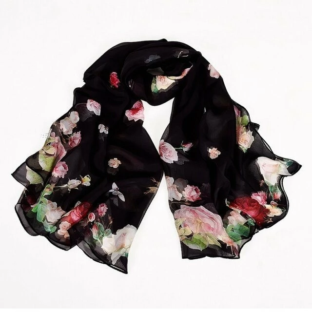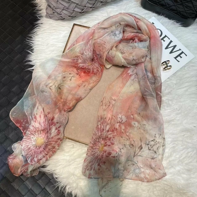 Escape the ordinary with this spring-inspired 100% pure silk scarf, showcasing striking colorful flowers