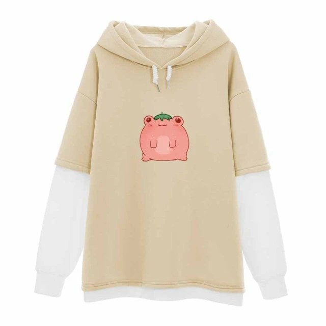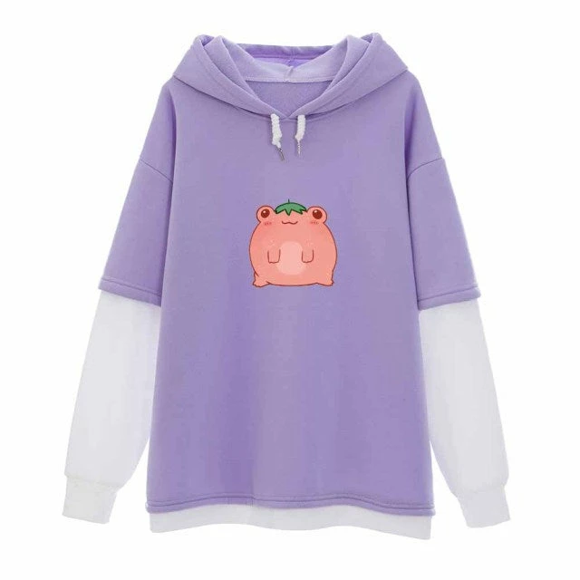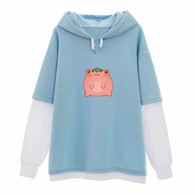 Show off your love for frogs, with our half-sleeve hoodie featuring an adorable pink frog believed to smell like strawberries and roses. With a kawaii half-white-sleeve style, this hoodie is perfect to pair with almost any outfit.
