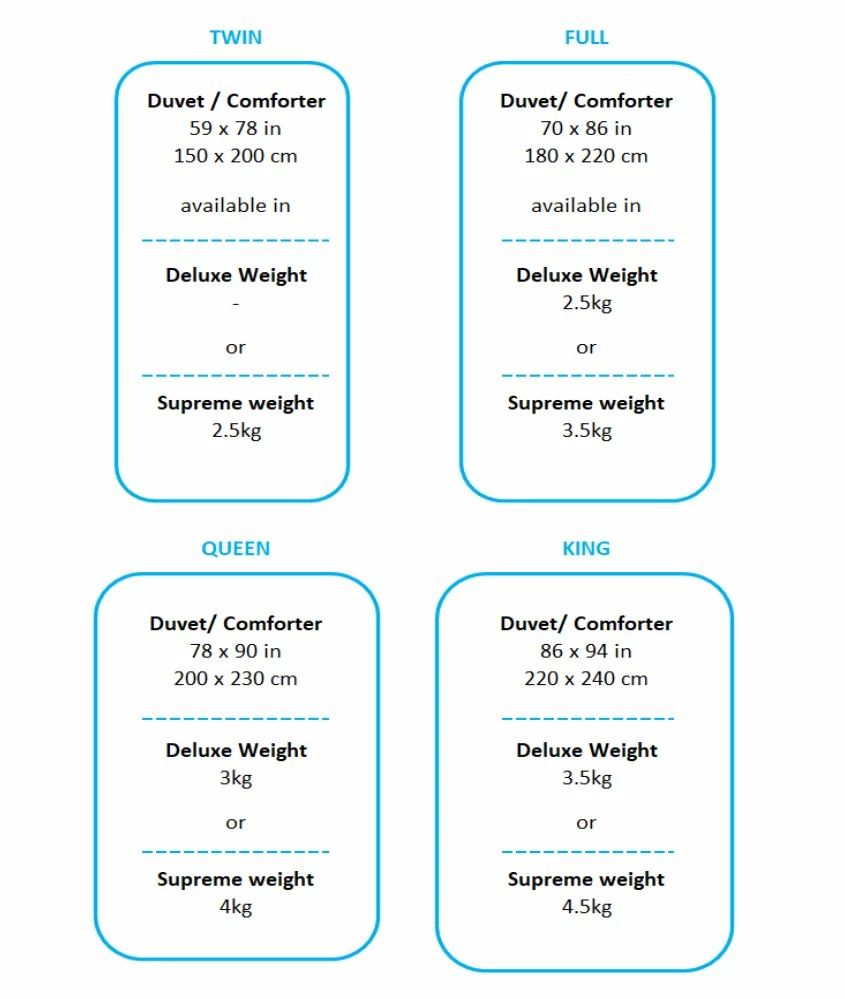 We believe the quality of a duvet is best expressed by its fill weight or total weight – how much Premium White Goose Down, per ounce. It’s simple, easy to understand, and gives you a solid idea of how heavy or light a duvet will feel.Â