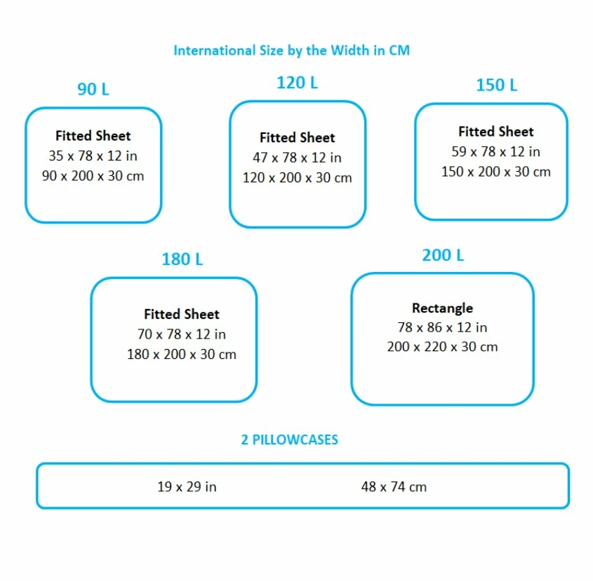 The bedding sheet for the mattress comes in five different sizes, measurements shown below:Â