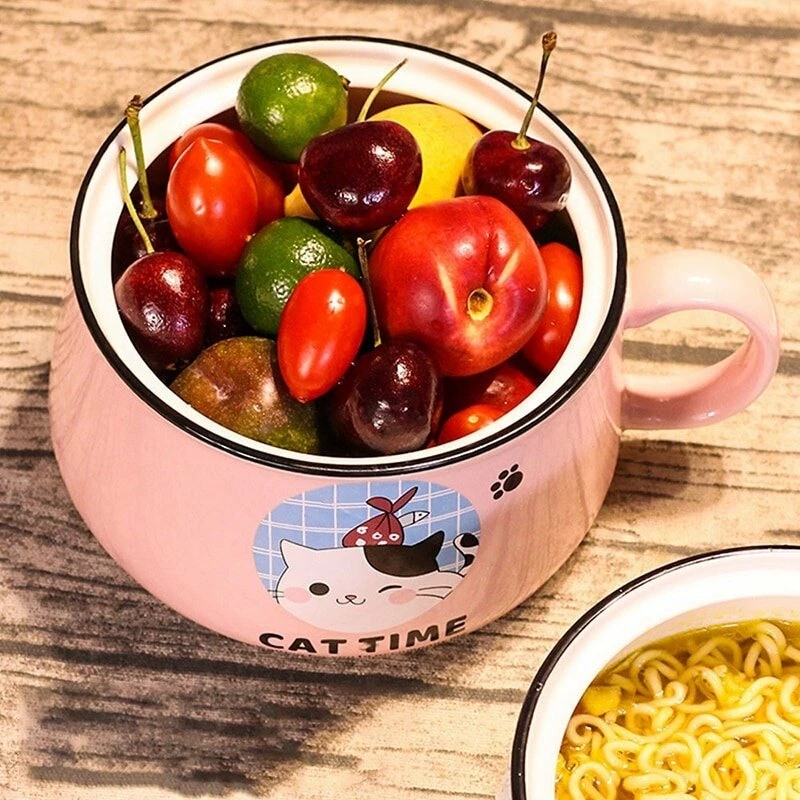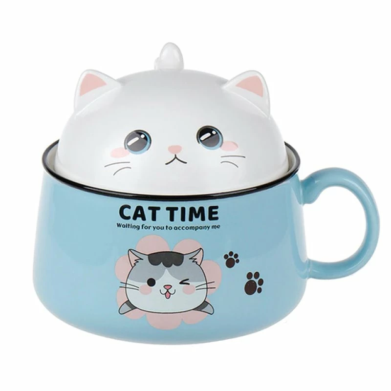 Ceramic Japanese Kawaiies Instant Noodles Cat Bowl made from fine porcelain with high quality. These cute big bowl with a cute handle have a kawaii style printed on them. Each cup boasts our adorable cat designs and is equipped with a metal spoon for stirring and a wooden lid to keep your drinks warm.