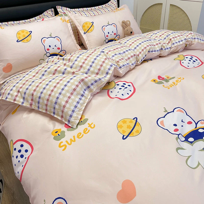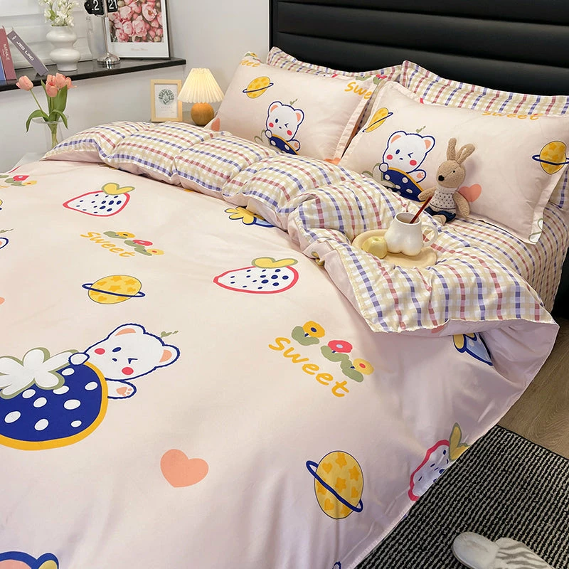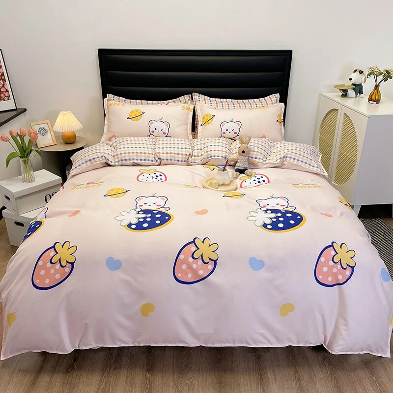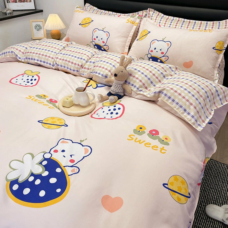 Made from smooth lightweight premium polyester for the ultimate softness and snuggles so you can get a good night’s sleep. Refresh your room with this soft cream bedding set featuring a bold strawberry print with white bears, planets, and dragon fruits.